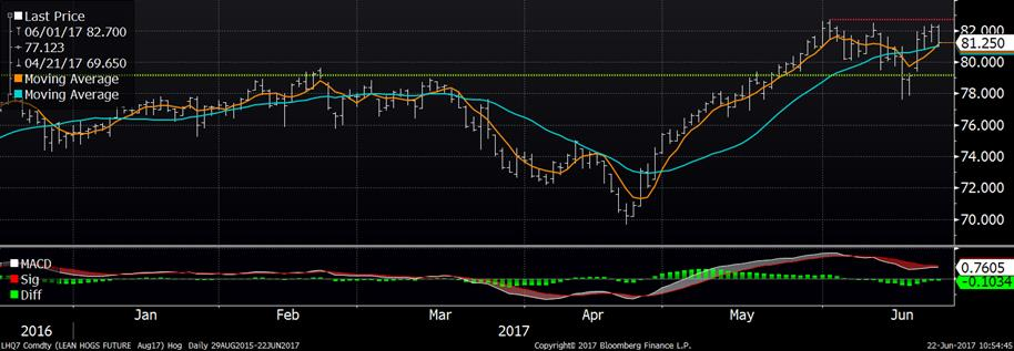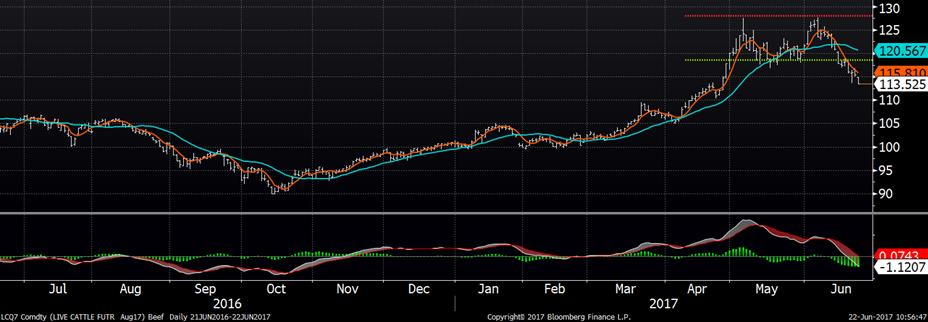 Le rapport de demain de Cattle-on-Feed devrait fixer les placements de veaux à 114% de mai 2016. L'inventaire d'approvisionnement du 1er juin se compose d'une estimation moyenne de 102.4% de l'année précédente dans une fourchette entre 101.7 et 103.6%. La commercialisation de mai est prévue d’être à 108.5% dans une fourchette d’entre 103.4% et 111.0%. Le rapport devrait montrer que le nombre de bœuf en parcs d'engraissement se maintienne près du volume de l’an dernier, mais indiquera aussi une plus grande quantité de bovin sur le chemin de l’abattoir pour l'automne (versus l’an dernier).