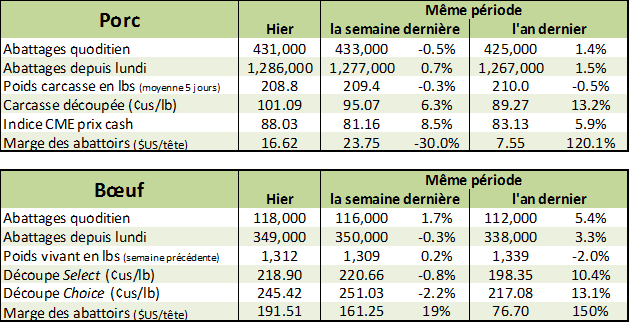 Le prix cash a grimpé au cours de la dernière semaine, mais ce rallye risque de manquer de souffle alors que le prix cash de l'Iowa / Minnesota hier après-midi était en baisse de 0.23¢/lb. L'indice cash CME est de 88.03 (+1.48)$. Le prix du porc découpé a cependant sauté pour une deuxième journée consécutive: la valeur de coupe de la carcasse de porc a augmenté de 2.24¢/lb, avec le bacon a gagné 20 ¢/lb depuis une semaine. La marge des abattoirs est estimée à 16.62 $USD/tête par HedgersEdge, contre 13.90 $USD/tête le jour précédent.