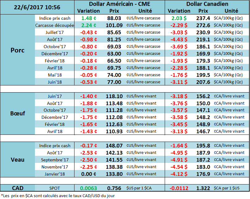 Prix cash - $CA/100kg