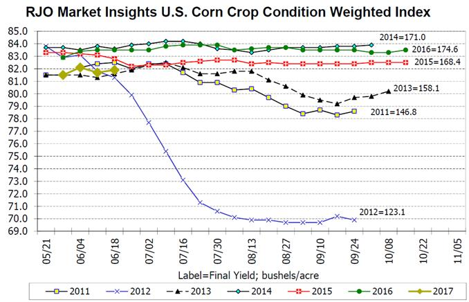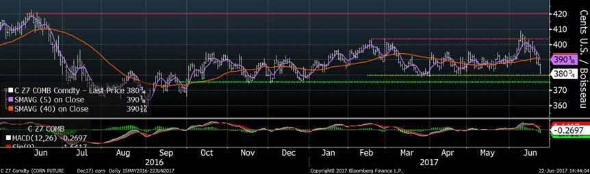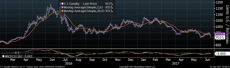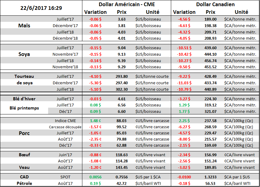 De son côté, le prix du maïs n’a pas baissé au point d’être en territoire inconnue, mais le prix s’est dégonflé sans répits cette semaine. À mon avis, beaucoup d’inventaires d’ancienne récolte a été liquidés et rendu au niveau actuel (juillet à 3.63 $US/boiss.), les producteurs auront peu d’intérêt à continuer de vendre. Bien qu’il est encore très tôt pour parler de rendement, l’indice RJO de la condition de la culture de maïs est à son plus faible depuis 2013 (pour la mi-juin)… il faudra donc des conditions exceptionnelles pour le reste de l’été afin de battre le rendement de l’an dernier. Bien que selon le bilan actuel de l’USDA, les inventaires américains baisseraient de 8% l’an prochain, plusieurs analystes prévoient des inventaires américaines entre 1.7 et 1.8 milliards de boisseaux ce qui correspond à une diminution de plus de 20%. En conséquence, le ratio inventaire/utilisation passerait de 16% à 13%. Aussi, les inventaires mondiaux diminueraient de 225 millions tonnes présentement, à 194 millions à l’été 2018, ce qui représente une baisse de 13%. En excluant le marché américain, la baisse des inventaires mondiaux de maïs serait de 15%. Finalement, le prix du blé fourrager a remonté à plus de 1.00 $US/boisseau au-dessus du prix du maïs ce qui devrait jouer en faveur du maïs pour la consommation animale. Avec tous ces facteurs, il serait surprenant que le prix du maïs soit inférieur à l’année 2016/17 alors que le prix actuel est revenu à la moyenne de 2016/17.