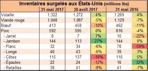 · Inventaires surgelés de porc : 4% de moins qu’en mai 2016 à 592 M lbs