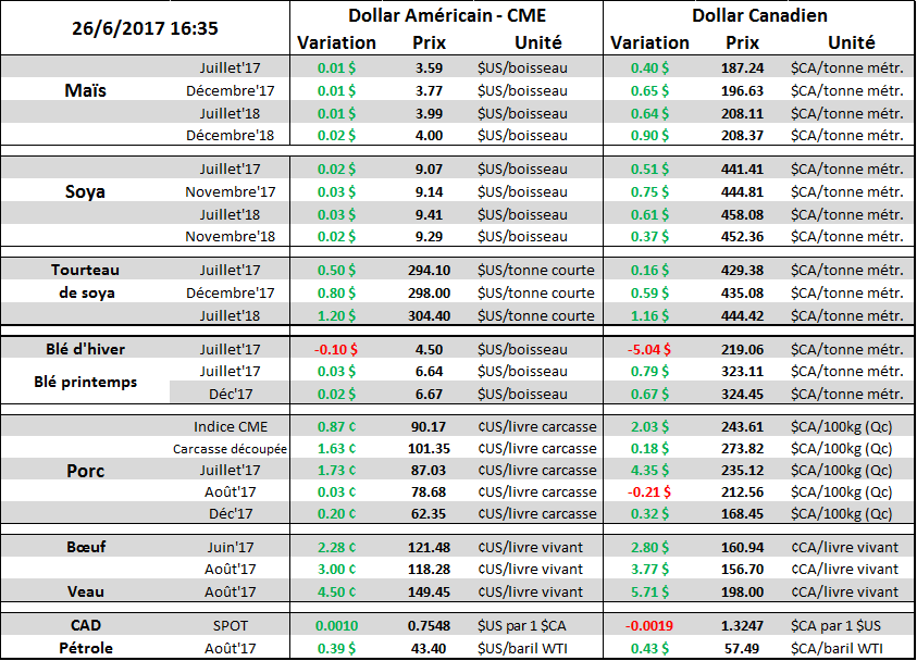 Pour la fève soya, le marché s’attendait à une amélioration de 1% alors que c’est le contraire dans le rapport de l’USDA avec 66% (-1%) de la culture qui est en bonne ou excellent posture. C’est nettement inférieur à l’an dernier avec 72% en b/e condition, mais c’est légèrement mieux qu’en 2015 alors qu’on était à 65%. De plus, 9% des plants de soya ont atteint le stade de floraison ce qui est en ligne avec la normale.