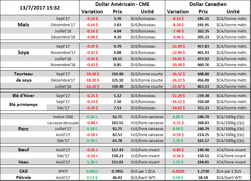 Peut-être que c’est le rapport USDA d’hier qui a maintenu les rendements inchangé à 170 BPA dans le maïs et 48 BPA dans le soja. Peut-être que c’est le fait que les inventaires mondiaux ont été revus à la hausse hier. Aussi peut-être que c’est les inventaires de fin aux États-Unis qui sont toujours abondant. Ou peut-être parce que les cartes météos sont plus clémente aujourd’hui. À mon avis c’est la combinaison de tous ces ingrédients. C’est comme le ciment : le calcaire, l’argile et l’eau séparément ça fait rien mais en les mélangeant on obtient un résultat épatant.