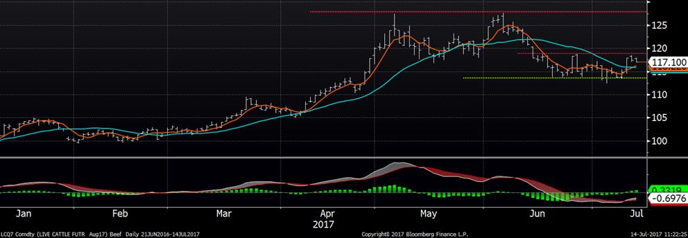 Les CàT de bœuf a ouvert hier en hausse et ils ont augmenté à leur plus haut niveau en 2 semaines mais n’ont pas pu maintenir les gains jusqu’à la fermeture. Tout de même, le prix a preservé les gains de +3 ¢/lb de mercredi dernier. L’échéance d’août a diminué -0.45¢/lb à 117.425, tandis que le mois d’octobre a fermé inchangé à 117.825 et décembre a diminué de -0.10¢/lb à 118.225. Les prix des coupes continuent à tomber, suivant la tendance des dernières années. Selon le rapport Boxed Beef le Choice a baissé -2.84¢/lb et le Select-1.47¢/lb. D’un point de vue technique, le support à 113.5 ¢/lb sur août résiste et représente le risque d’une contraction à court terme versus une 1ère résistance à 119 ¢/lb et une 2ème à 128 ¢/lb (voir graphique).