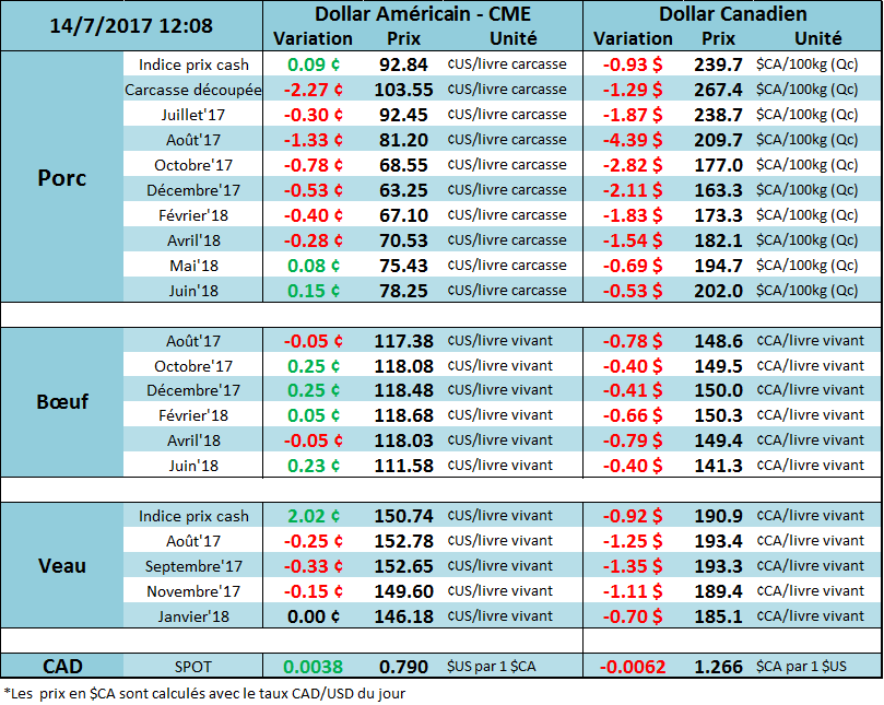 Ce matin, le marché se contracte en raison d’une baisse des prix cash. Premièrement, la valeur de découpe de la carcasse du porc fût publié à -2¢/lb à 103.7, principalement à cause d’une baisse de 12.3 ¢/lb des ribs. Deuxièmement, le prix cash d’hier fût publié ce matin à 92.67 (-0.22) ce qui donnera un indice CME à 92.78 (-0.06) lundi. C’est la première fois que l’indice CME diminue depuis la fin avril ce qui lance un signal de vente pour plusieurs éleveurs qui attendaient ce revirement. Toutefois, le marché semble ignorer le rebond de la découpe pour les ventes de ce matin, à 104.87 (+1.20) ¢/lb. La marge des abattoirs restent fortes à près de 30 $ par tête en date d’hier.