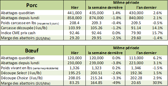 Ce vendredi, l’USDA publiera les statistiques des parcs d’engraissement de plus de 1000 têtes. Les analystes sondés s’attendent à une augmentation des placements de +5.9% par rapport l’an dernier, soit 1.62 millions de veaux. Avec une commercialisation qui devrait avoisiner +4.6% (2.0 millions de têtes), ça laisserait un inventaire en parc de 10.65 millions têtes ce qui représente une augmentation de 2.8% par rapport au 1er juillet 2016.