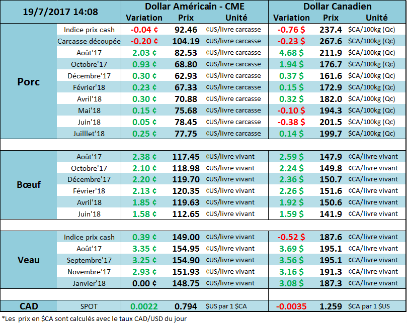 Le prix du bœuf a terminé la journée d’hier à la baisse de presque 2 ¢/lb sous la pression du prix des découpes qui continue de tomber. La valeur des coupes Choice a baissé de -1.00 à 208.05 ¢/lb et le Select a diminué de -0.56 à 195.25 ¢/lb. Néanmoins, l’encan électronique de ce matin affichait un prix moyen de 118.27 ¢/lb pour les livraisons des 2 prochaines semaines ce qui a redonnée du souffle au prix. Cette donnée a permis au CàT d’août de rebondir à 117.40 ¢/lb après avoir touché un creux de 6 jours en matinée à 114.30. Le prix continue de faire des va-et-vient à l’intérieur de la zone du dernier mois (113.5 – 119).