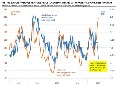 De plus, la découpe reste élevée à 105.25 ¢/lb ce matin, principalement grâce au bacon qui atteint un record historique à 212 ¢/lb. Cependant, c’est ce qui rend le prix du porc vulnérable d’une sévère correction ces prochains semaines et peut expliquer en partie l’énorme écart entre le cash et les CàT. Présentement, le prix des découpes est 13 ¢/lb de plus que l’an dernier et sur cette augmentation, il y a 11 ¢/lb qui est attribuable au prix du bacon (voir image). Historiquement, il y a délai d’environ 6 semaines avant que la variation du prix du bacon se reflète sur les prix en épicerie et nous sommes sur le point de voir le prix monter sur les tablettes (vite, faites vos réserves!). Cela pourrait impacter négativement la demande de bacon au cours des prochaines semaines et comme nous l’avons déjà vu dans le passé, la valeur du flanc peut reculer très rapidement. Par exemple, en octobre 2015 : -27% en 1 semaine, en juillet 2016 : -30% en 1 semaine et cette année en février : -25% en 2 semaines. Il y a donc un réel risque de voir le prix des découpes reculer subitement lorsque les prix du bacon auront augmenté en épicerie.