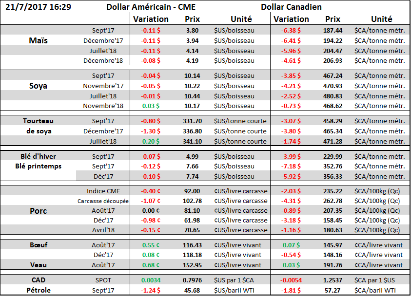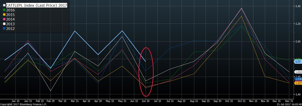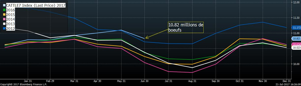 Le rapport Cattle-on-Feed d’aujourd’hui était particulièrement négatif pour les prix. Comme les mois précédents, la surprise est au niveau des placements. Les analystes s’attendaient à une augmentation des placements à +6.1% en moyenne avec une fourchette entre 3.1% et 8.2%. En juin, les placements ont été de 1.77 millions de têtes, soit 16.1% de plus qu’en 2016, c’est largement au-dessus des prévisions. Cela vient s’ajouter aux forts placements des derniers mois : mars à +11.9%, avril à +11.1% et mai à +12.2%... il ne manquera pas de bœuf cet automne (négatif pour les CàT d’octobre et décembre)! Le troupeau en parc est particulièrement jeune ce qui ne devrait pas trop mettre de pression négative sur le prix cash à très court terme.