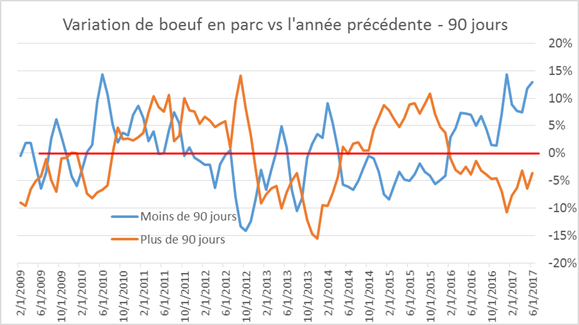 · Les inventaires de bœuf en parc d’engraissement largement au-dessus des attentes à +4.5% de 2016.