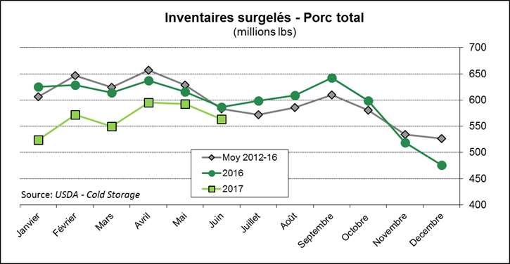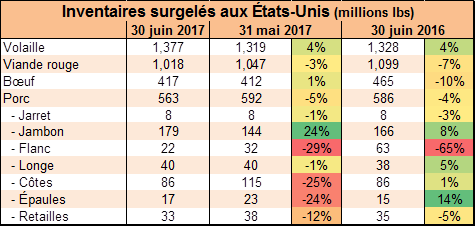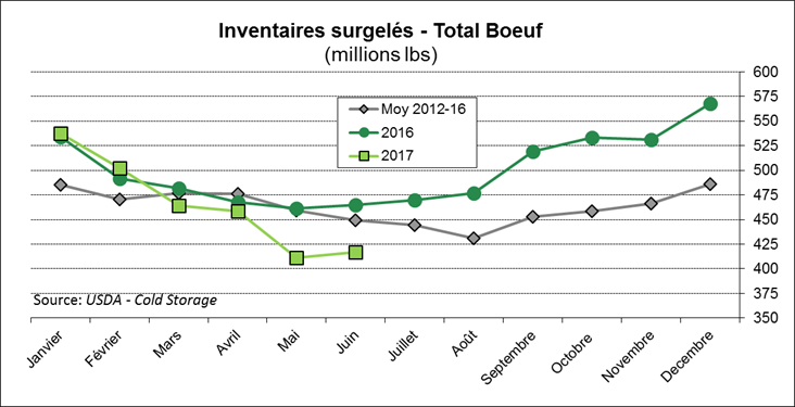 En date du 30 juin, les inventaires surgelés de bœuf étaient de 416.7 millions de livres ce qui est 10% de moins que l’an dernier. À l’exception du moins précédent, ce sont les plus petits inventaires surgelés depuis novembre 2014. Concernant les inventaires de viandes rouges, ce sont les plus petits depuis décembre 2014 à 1018 millions lbs ce qui représente une baisse de 7.4% par rapport l’an dernier.