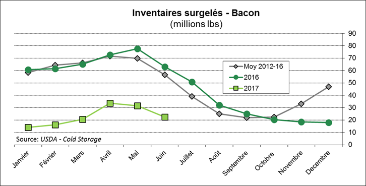 Hier après-midi, l’USDA publiait les inventaires surgelés au 30 juin. Les inventaires totaux de porc étaient de 563 millions lbs ce qui est légèrement sous les stocks de l’an dernier. Sans surprise, ce sont les inventaires de bacon qui créent cet écart avec les inventaires de l’an dernier en raison de la pénurie de flanc de porc. Les inventaires de bacon étaient de 22.3 millions lbs soit 65% sous le volume de l’an dernier. D’ailleurs, on note que la popularité des coupes grasses ne se limite pas seulement au porc. Les inventaires d’ailes de poulet sont 33% plus faible que l’an dernier à 60.6 millions lbs alors que les inventaires de poulet sont pratiquement inchangés. Avec le récent changement de diète aux États-Unis, les cardiologues américains auront beaucoup d’ouvrage ces prochaines années.