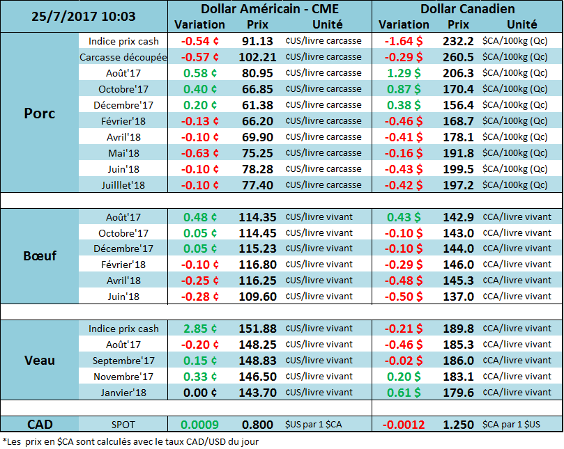 Malgré une avant-midi difficile, le prix du porc a remonté hier vers la fin de la séance pour effacer la moitié de sa perte journalière. L’ensemble des échéances ont perdu environ 0.75 ¢/lb ce qui donne un CàT d’août à 80.38 ¢/lb, octobre à 66.45 et décembre à 61.18. Bien que le marché semble s’affaiblir sous les anticipations d’une offre de viande abondante ces prochains mois, le prix d’octobre a remonté pour clôturer sur son support technique de 66.5 ¢/lb. On surveillera de près la fermeture d’aujourd’hui puisqu’une journée négative additionnelle pourrait bien ouvrir la porte pour une baisse jusqu’à 63.0 ¢/lb. Rappelons-nous que l’an dernier, le CàT d’octobre avait baissé de 74.5 ¢/lb à la mi-juin à 48 ¢/lb au début d’octobre… le marché sera donc sur la défensive ces prochaines semaines.