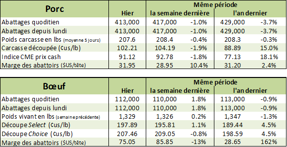 La valeur de la carcasse découpée était de 102.2 ¢/lb hier, en léger recul depuis la semaine dernière à cause d’une baisse du prix des longes de porc. Le prix du bacon reste collé près de son sommet historique à 215.7 ¢/lb et demeure la principale coupe qui explique l’énorme écart entre la valeur de la carcasse découpée présentement comparativement à l’an dernier. Cependant, on s’attend à ce que le prix du bacon commence à augmenter sur les tablettes d’épicerie aux États-Unis ce qui devrait causer un ralentissement la demande prochainement.