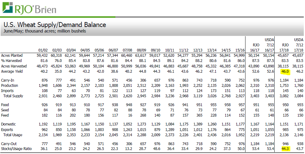 Les rendements dans le blé variant grandement selon le type. Pour le blé d’hiver, lequel est presque tout récolté, RJO prévoit un rendement de 49.8 b/a ce qui est très similaire avec l’USDA. Lorsqu’on combine la chute des acréages et la baisse du rendement, on obtient une production de 1.28 milliard de boisseaux comparativement à 1.67 milliard l’an dernier (-23%). Cependant, à cause de l’énormité des inventaires américains et mondiaux, on est encore loin d’une pénurie… ce qui n’est pas le cas pour le blé de printemps. R.J. O’Brien prévoit un rendement de 39.5 b/a pour le blé de printemps, comparativement à 46.7, 46.2 et 47.2 boisseaux/acre ces 3 dernières années. De plus, la production canadienne n’est pas en très bonne état également. Pour les États-Unis, la production devrait rester tout juste au-dessus du 400 millions de boisseaux, en baisse de 27% par rapport la production moyenne des 3 dernières années.