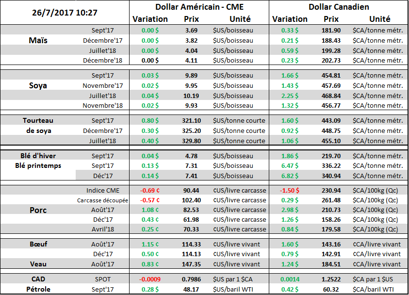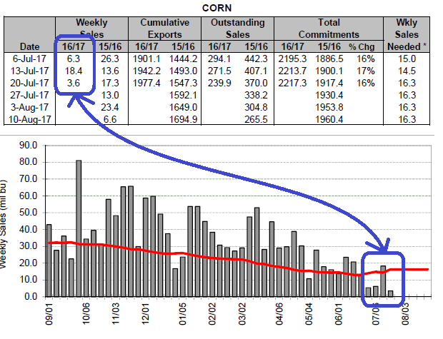 À priori on ne croit pas que c’est un gros problème pour l’ancienne récolte car de toute façon le programme est déjà très bien avancé par contre cela pourrait influencer le bilan de la prochaine récolte. Au moins l’USDA semble déjà avoir prévu le coup car les exportations 2017/18 sont évaluées à 1.875 milliard, une baisse de 16% (350 millions de boisseaux) par rapport à cette année.