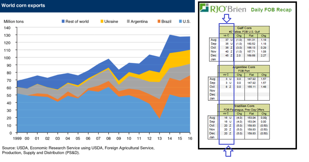 Très « décevant » dans le cas du blé d’inde qui a atteint 3.6 millions de boisseaux, c’est très faible et nettement sous les attentes. En fait l’exportation depuis le début de l’année (septembre 2016) a été très solide et c’est pourquoi l’USDA prévoit une quantité astronomique dans son bilan 2016/17 avec 2.225 milliard de boisseaux. Par contre depuis 4 semaines on remarque clairement la pression du programme d’exportation au Brésil! La situation aujourd’hui est bien différente d’il y a 20 ans car les exportations mondiales de maïs sont aujourd’hui beaucoup mieux distribuées entre les USA, le Brésil, l’Argentine et l’Ukraine. Actuellement les bases FOB sont beaucoup plus compétitives en Amérique du Sud que dans le golfe ; on parle de +35 Sept aux États-Unis versus +3 Argentine et +16 Brésil qui représente une différence de 10 à 15 dollar la tonne!