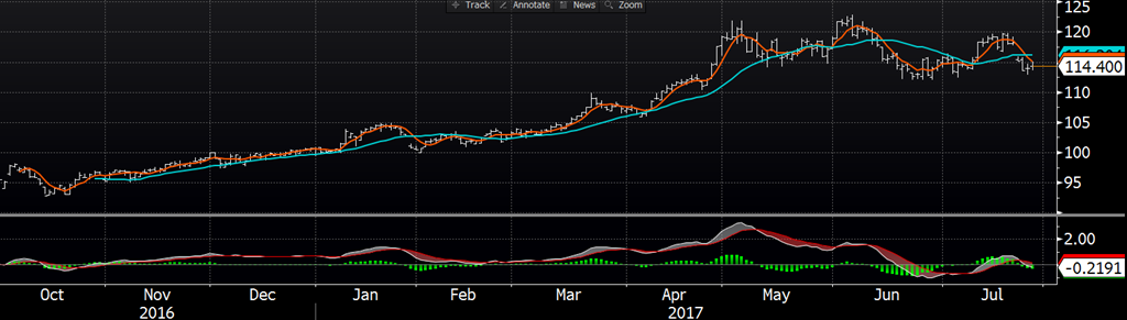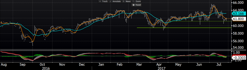 Avec un écart de prix entre le cash et les futures rapprochés de aout/octobre, c’est difficile d’attirer de nouveaux vendeurs car ils doivent accepter de vendre à « rabais » par rapport au cash. Ceci pourrait justifier un rebond temporaire et offrir une opportunité de mise en marché car les participants doivent tout de même composer avec une significative augmentation de la production pour la 2e moitié de l’année 2017. Jusqu’à maintenant la demande Chinoise ne se fait pas ressentir autant que souhaité sur les marchés américains et pourrait laisser un surplus d’inventaire pour le marché domestique. La découpe est sortie à 99.23 hier et représente la plus faible valeur depuis le 22 juin dernier.