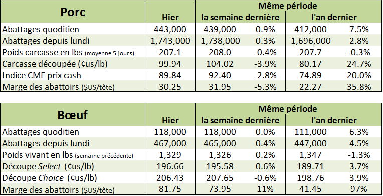 La faiblesse des prix du bœuf et les anticipations d’un marché baissier dans les prix maintiennent les futures nettement sous la valeur des prix au comptant (cash). D’ailleurs le marché doit composer avec des inventaires élevés à court terme et la position des fonds pourrait poser problème s’ils décident de liquider leur massive position longue (achat).