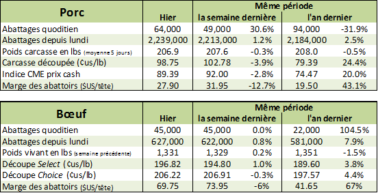 L’annonce vendredi du Japon met de la pression sur le prix du bœuf. Selon le Japan News, le Japon prendrait une mesure de « sauvegarde » (c’est-à-dire restreindre temporairement les importations d’un produit) pour protéger une branche de production nationale donnée contre l’accroissement des importations d’un produit qui cause ou menace de causer un dommage à l’industrie locale. Autrement dit, les importations japonaises de bœufs américains deviennent trop importants par rapport l’industrie locale dont les coûts de production sont forts possiblement plus élevés qu’aux É.-U. Le pays du soleil levant imposerait une taxe plus élevée afin de protéger son industrie bovine. Au final, le Japon augmentera temporairement les tarifs douaniers de 38.5% à 50% sur les importations de bœuf américain. Selon les exportations américaines des 12 derniers mois, le Japon est le plus important client des É.-U. avec une moyenne de 61 millions lbs par mois ce qui représente 27% des ventes américaines ou 3% de la production mensuelle. L’impact de ce nouveau tarif par le Japon peut donc être significatif sur la demande extérieure de bœuf américain et est négatif pour le prix. Le marché baisse de 1¢/lb ce matin.