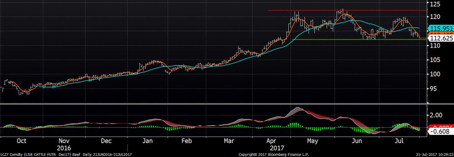 La semaine dernière, les abattages étaient de 627,000 têtes en hausse de 5,000 bœufs par rapport la semaine précédente (+0.8%) et 47,000 têtes de plus que l’an dernier (+8.1%). Le poids reste une vingtaine de livres en-dessous de celui de l’an dernier, présentement à 1331 lbs/vivant ou 807 lbs/carcasse. Somme toute, la production hebdomadaire s’établit à 505 millions lbs, en hausse de +0.9% et +5.7% par rapport la semaine précédente et l’année dernière respectivement. Du côté des spéculateurs, entre le 19 et 25 juillet, ils ont vendu un total de 2593 CàT pour réduire leur position à 100,700 CàT d’achetés. D’août 2015 à novembre 2016, la moyenne des positions des spéculateurs était de 30,000 CàT d’achetés, il y a donc de la place pour que les spéculateurs liquident leur position si une tendance baissière s’amorce.