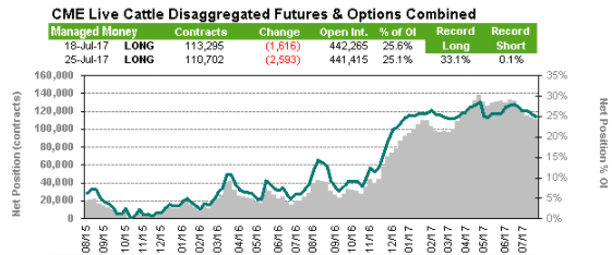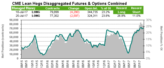 La production hebdomadaire était de 464 millions lbs en hausse de seulement +2.0% par rapport l’an dernier. Cette production provient de l’abattage de 2.24 millions porcs (+2.1% vs 2016) et d’un poids carcasse à 207 lbs. Chez les spéculateurs, du 19 au 25 juillet, ils ont vendu un net de 2,600 CàT pour réduire leur position à 77,300 CàT d’achetés. Leur position représente 24% de tous les CàT existants ce qui est près du record de 27%, il y a donc un risque que les spéculateurs liquident leur massive position au cours des prochains mois sous la pression saisonnière.