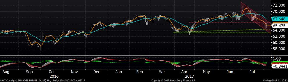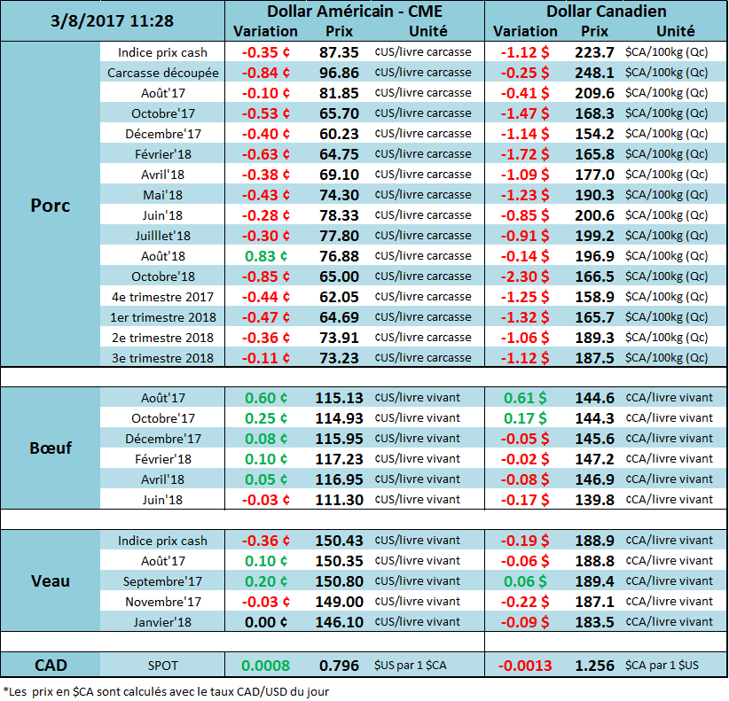 Les CàT de porc ont fini en hausse hier suite à la publication du prix cash du 1er août. L’échéance d'août a fermé +2,15 ¢/lb à 81.95, le contrat d'octobre a augmenté de +1.825 ¢/lb à 66.23 et le mois de décembre a terminé +1.225 ¢/lb à 60.625. Le marché avait touché un nouveau creux en matinée avec décembre qui avait passé sous la barre du 59.00 ¢, mais les prix ont tous remonté après que l’USDA rapporte le prix cash du 1eraoût à 87.26 (-0.18) ce qui donne un indice CME à 87.35 (-0.34) ce matin.