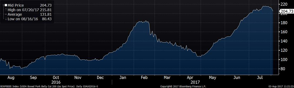 Cependant, la valeur de la carcasse découpe continue de mettre de la pression sur les prix. Pour la journée d’hier, les coupes ont touché un nouveau bas à 96.86 ¢/lb (-1.96) ainsi que le bacon qui commence à reculer à 204.73 ¢ (-4.96). Face à ce recul, les prix ont ouvert à la baisse de plus d’une cent la livre ce matin, mais comme hier, le prix cash qui diminue plus lentement qu’anticipé vient sauver la journée. Le deux tiers de la baisse matinale s’est effacée après que l’USDA rapport un prix à 86.97 ¢/lb pour hier pour un indice à 87.11 ¢/lb (-0.24) demain. Présentement, avec l’échéance d’août à 81.7, le marché anticipe une baisse moyenne de -0.67 ¢/lb par jour alors qu’on est à -0.4 cent par jour cette semaine.