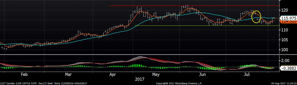 Les CàT de bœuf ont augmenté hier. Le CàT d’août s’est terminé avec un hausse de +1.73 ¢/lb à 114.53, tandis que octobre a gagné +1.80 ¢/lb pour s’établir à 114.68 et en décembre de +1.675¢/lb à 115.875. Les contrats à terme ont dépassé leur niveau le plus élevé depuis plus d'une semaine, bien que les mois d'octobre et décembre soient restés inférieurs aux moyennes mobiles principales et sont juste en dessous des gaps formés il y a quelques semaines. Ces écarts sont de 115.175 $ à 116.85 $ en octobre (voir cercle jaune ci-desous) et de 115.95 $ à 117.725 $ en décembre.