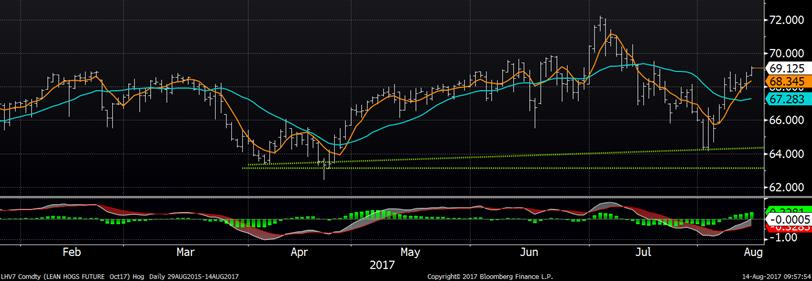 Les abattages de la semaine dernière étaient relativement faible comparativement à ce qu’on devait s’attendre avec le rapport Hogs and Pigs de juin. Les abattages étaient de 2.27 millions têtes ce qui représente une croissance de seulement +1.2% par rapport la même semaine en 2017. C’est possiblement ce qui explique pourquoi le CàT d’août terminera près de son sommet : la production fût plus faible qu’anticipée alors que la demande reste très forte. Le poids est similaire à l’an dernier à 207 lbs/carcasse, cela donne une production de 470 millions de livres, en hausse de 0.8% et 1.2% par rapport la semaine précédente et l’an dernier respectivement.