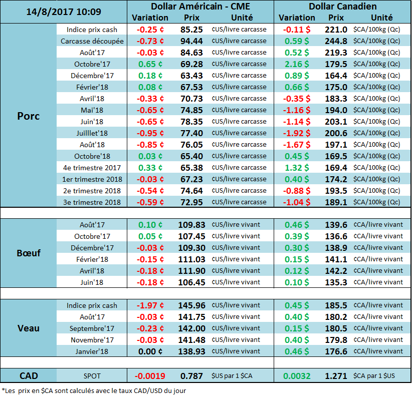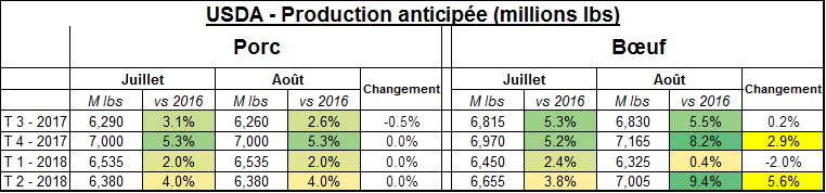 Dans le rapport USDA de la semaine dernière, l’USDA a fortement augmenté la production du 4èmetrimestre ainsi que du 2ème trimestre de 2018. Pour le dernier trimestre de l’année, la production a été revue à la hausse par 2.9% à 7.165 milliards de livres ce qui représentera une augmentation de +8.2% par rapport au 4ème trimestre 2016. En contrepartie, la production du 1er trimestre a été réduite par 125 millions de lbs (-2.0%). La pression sur le marché à terme devrait donc être concentrée sur les CàT d’octobre et décembre. Pour le 2ème trimestre de 2018, la prévision de production a été augmentée par 350 millions lbs ce qui représentera une croissance de +9.4% par rapport la production du 2ème trimestre 2017, c’est énorme. En plus d’avoir augmenté les prévisions de production, l’USDA a revu à la baisse les exportations de bœuf; en juillet, on s’attendait à des exportations nettes de 27 millions lbs alors que dans le rapport d’août, l’USDA prévoit des importations nettes de 48 millions. Avec tous ces ajustements, les consommateurs américains auront en moyenne 57.9 lbs à consommer en 2017 comparativement à 57.1 lbs dans les prévisions de juillet. En conséquence, l’USDA a corrigé ses prévisions de prix par -4 ¢/lb pour les 2 derniers trimestres de 2017.