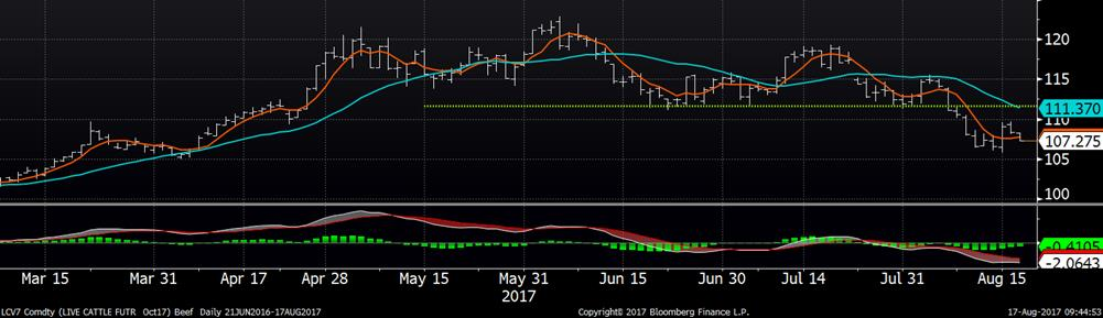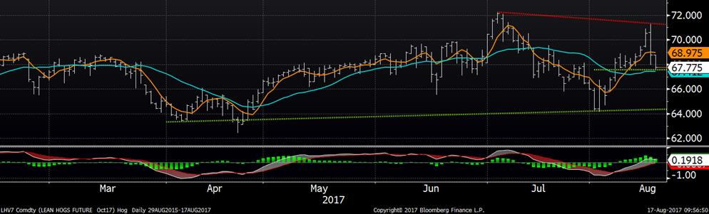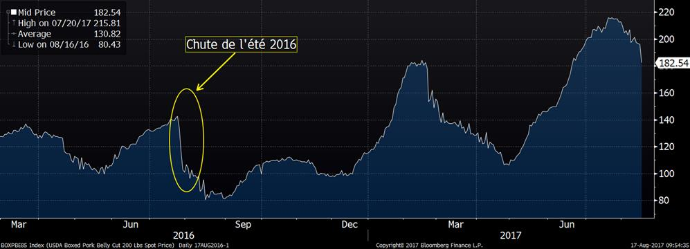 Hier à l’ouverture du marché, le prix d’octobre touchait un nouveau sommet à 71.325 ¢/lb et décembre à 65.35 ¢/lb. Cependant, le marché n’a pas tenu le coup et a brusquement changé de direction en raison de la chute du prix du bacon. La valeur de la carcasse découpée a chuté de -2.30 ¢/lb à 91.55 hier, mais la baisse est concentrée sur le flanc qui a chuté de -13.59 ¢/lb à 182.54. Une chute aussi drastique inquiète beaucoup pour les jours à venir. Si on se réfère aux années précédentes, une baisse importante de la valeur du bacon entamait la dépréciation saisonnière des découpes. Autrement dit, ça l’indique que la demande estivale tire à sa fin et c’est qui explique la faiblesse des prix des contrats en après-midi. Par moment, le contrat d’octobre affichait une baisse de 2.57 ¢/lb sur la journée, assez près du « limit down ». Au final, le prix du CàT d’octobre a terminé la séance à 68.78 (-1.75 ¢/lb) et sur décembre à 63.48 (-1.22). De plus, les abattages pour les 3 premiers jours de la semaine se situent à +3.25% par rapport l’an dernier. L’offre de viande pourrait donc retourner vers les prévisions de l’USDA, contrairement à ce qu’on a vu la semaine dernière.
