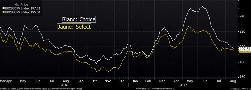 Dans l’encan électronique d’hier, il n’y a eu aucune transaction ce qui est assez rare… mais ça reflète la situation du marché cash également. Les abattoirs offrent 110 ¢/lb et les parcs demandent 115 ¢/lb (le prix cash était de 114 – 116 ¢/lb la semaine dernière). Si on se fie au prix du Càt d’août, présentement à 108.3 ¢/lb, il faut s’attendre à une contraction du prix cash ces 2 prochaines semaine. La valeur des découpes continue à se déprécier graduellement, la valeur du Choice était à 197.51 (-1.44) et le Select à 195.04 (-0.83). Depuis le début de la semaine, les abattages s’établissent à 350,000 têtes ce qui est encourageant, seulement +3.2% par rapport l’an dernier.