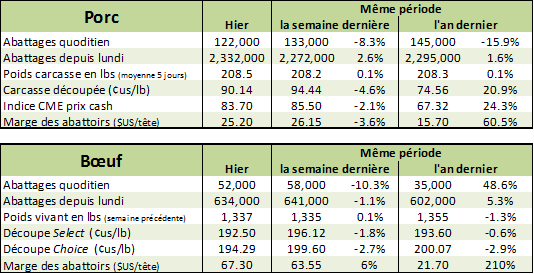 Pour la journée de vendredi, des ventes cash à 109 ¢/lb ont été répertoriées ce qui indique que la tendance baissière continue. Le CàT d’août est rendu à 106 ¢/lb, on devrait donc s’attendre à une dépréciation supplémentaire de 3 ¢/lb d’ici deux semaines. Le marché des découpes a perdu un peu moins de 1% vendredi avec le Choice à 194.29 (-1.34) et le Select à 192.50 (-1.70). Le marché boursier se stabilise aujourd’hui avec peu de variation. Cette semaine, il y aura la publication des inventaires surgelés demain et le rapport Cattle-on-Feed vendredi à 15h00.
