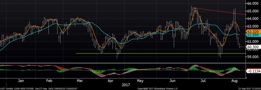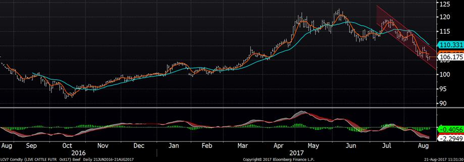 Pour la troisième semaine d’août, les abattages de porc étaient seulement à 2.33 millions têtes ce qui est à peine 1.6% plus élevée que l’an dernier. Le poids moyen des carcasses est de 207 lbs, en ligne avec l’an dernier. La production était donc de 482 millions lbs en hausse de 2.6% et 1.5% par rapport la semaine précédente et l’an dernier respectivement. L’offre de porc continue d’être nettement sous les prévisions du 3ème trimestre de +2.6% par rapport le même trimestre en 2016. Cependant, la production de 7 milliards de livres anticipée pour le 4èmetrimestre représentera +5.3% de la production de l’an dernier, en même temps que la production de bœuf sera +8.2% de celle du 4èmetrimestre 2016. Cette abondance explique l’écart élevé entre le prix cash versus ceux d’octobre et décembre.