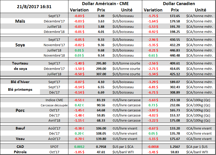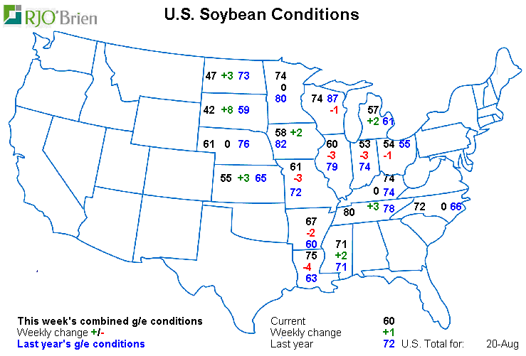 · Condition du soya : +1% à 60% bon/excellent, versus 72% l’an dernier