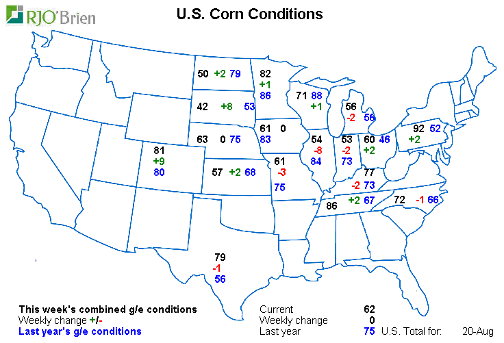 · Condition du maïs: inchangée à 62% bon/excellent, versus 75% l’an dernier
