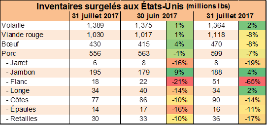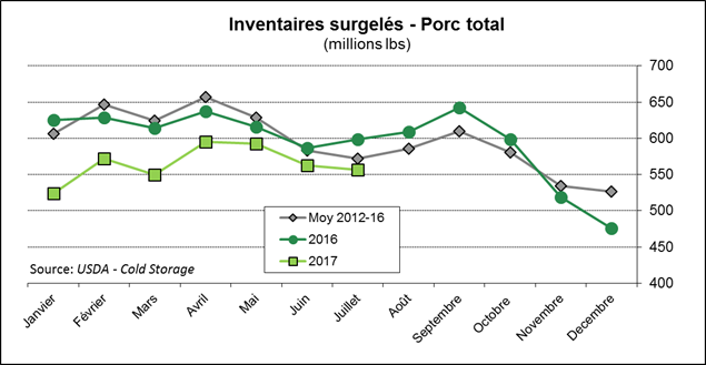 Au 31 juillet, les inventaires surgelés étaient de 556 millions lbs, c’est légèrement sous la moyenne 5 ans et 7% sous la quantité de juillet 2016. Les inventaires de flanc ont diminué de 4 millions lbs et l’énorme déficit qu’on avait avec la normale se rétrécie. Aussi, les inventaires de retailles sont à leur plus faible niveau depuis septembre 2010 à 29.9 millions livres. La petitesse des stocks de bacon et des retailles démontre bien la forte demande pour les coupes plus grasse.