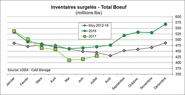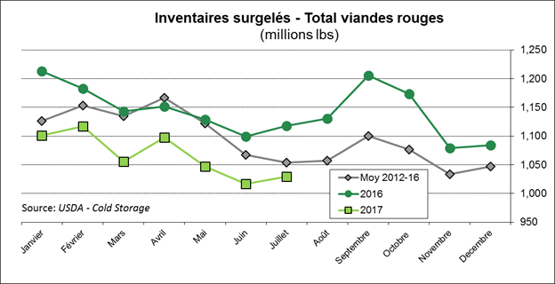 Les inventaires surgelés de bœuf au 31 juillet étaient de 430.4 millions de lbs, c’est une augmentation pour un 3ème mois consécutif. Le déficit qu’on avait en mai, à 10% sous la normale, disparaît graduellement. Avec la volumineuse production anticipée pour le 4èmetrimestre, on risque de voir les inventaires surgelés augmenter au cours de l’automne, comme l’an dernier.