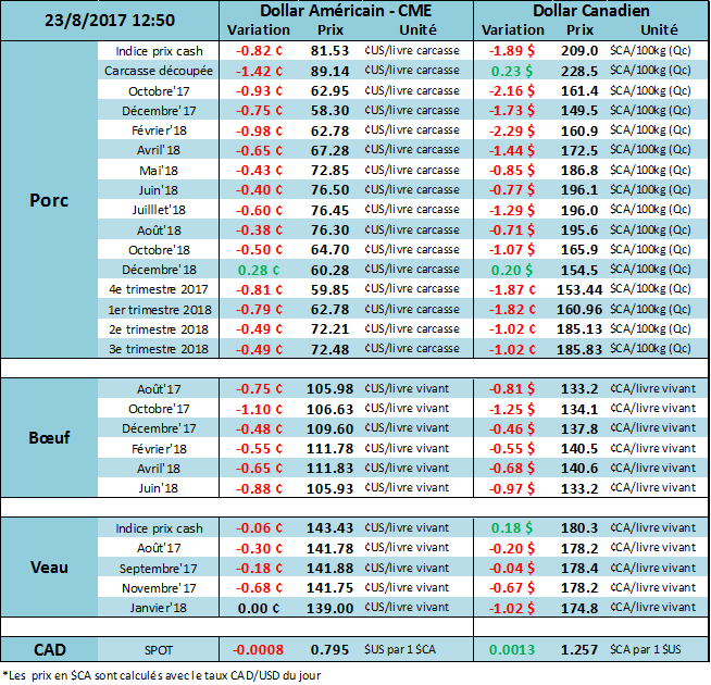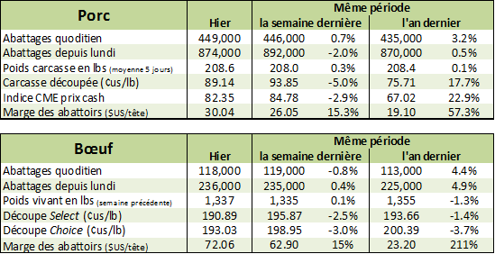 Après un rebond de presque 2 ¢/lb hier, le prix recul aujourd’hui effaçant la moitié du gain d’hier. L’encan électronique nous a pas donné d’information sur le prix cash puisqu’il n’y a pas eu de volume transigé, comme la semaine dernière. Encore une fois, il y a un écart trop important entre les offres des abattoirs (106 ¢/lb) et le prix demandé par les parcs (110 ¢/lb). Cependant, avec CàT d’août à 106 ¢/lb, il est très peu probable que les abattoirs enchérissent leur mise pour acheter leur bœuf.