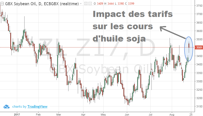 L’autre nouvelle qui est venu secouer le marché est au niveau politique. Le ministère du Commerce (Departement of Commerce) a giflé des droits d'importation de 64 à 68% sur le biodiesel argentin et indonésien en disant qu'ils bénéficient de subventions dans leur pays d'origine et bénéficient de crédit (programme RFS) des États-Unis. On s’attendait que le ministère agisse, mais la sanction est supérieure aux taux attendus et fermera presque certainement les importations. Les prix ont varié fortement aux niveaux des huiles de soja avec une hausse de 2% des prix qui a par la suite reculé un peu.