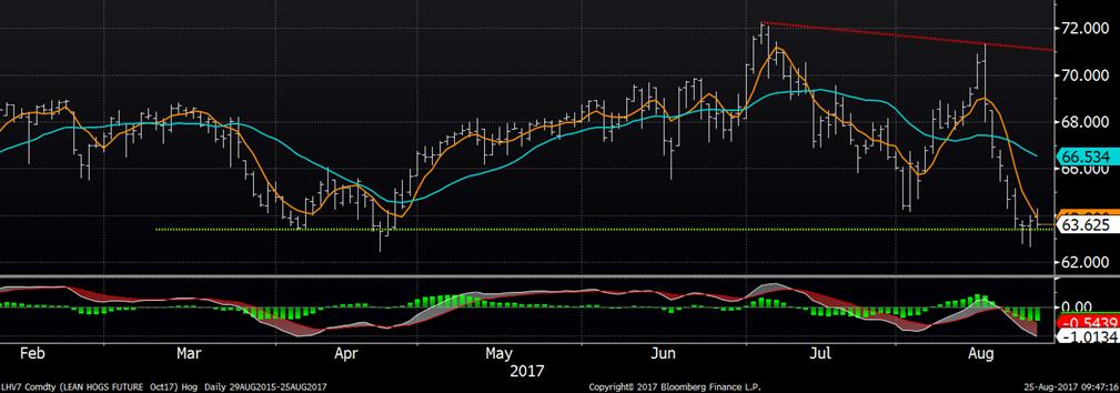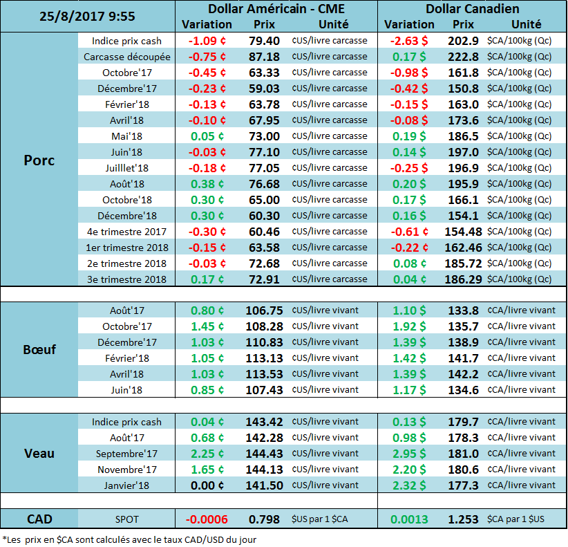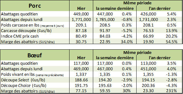 Malgré le fait que le prix du porc avait touché un nouveau creux en matinée hier, le prix a légèrement rebondi pour mettre fin à la correction de 6 jours consécutifs. Toutefois, la situation ne s’améliore pas au niveau du prix cash lequel a baissé de -1.32 ¢/lb le 23 août ce qui donne un indice à 79.40 (-1.09) ce matin. C’est la plus importante baisse journalière pour le prix cash depuis novembre 2015, lorsque l’OMS avait publié un rapport reliant la consommation de viande rouge au cancer colorectal. Du côté des découpes, le prix du bacon affichait un nouveau bas hier à 145.6 ¢/lb (-6.41), mais les autres coupes restent stable depuis plusieurs jours. La valeur de la carcasse découpée a diminué de -0.75 ¢/lb à 87.18, précisément à cause du bacon. Pour les 4 premiers jours de la semaine, les abattages cumulés sont de 1.77 millions de têtes, soit 2.3% de plus que l’an dernier à pareille date.
