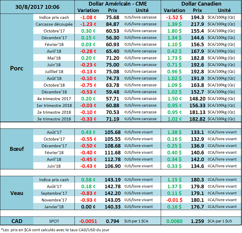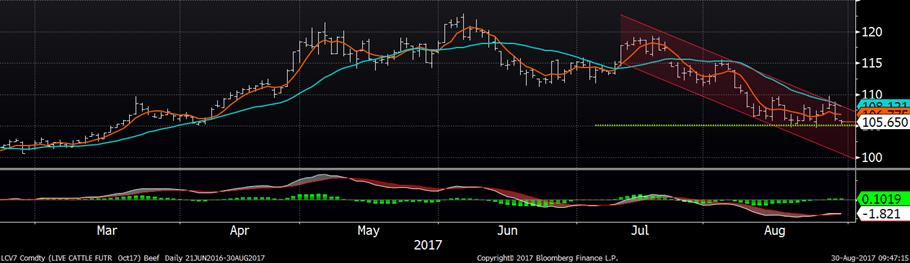 Le prix du bœuf a reculé de 2.2 ¢/lb hier pour les livraisons d’octobre et décembre, effaçant les gains des 2 séances précédentes. L’USDA a rapporté des ventes de 1891 têtes au Nebraska à la mi-journée à 168 ¢/lb carcasse ce qui correspond à une baisse de 2 ¢/lb par rapport la semaine dernière. On n’a donc pas réussi à sortir du canal baissier, il aurait fallu terminer dans le positif pour confirmer la fin de cette tendance. Le marché baisse un peu ce matin, d’environ une demi cent, on retourne tester le support de 105.5 ¢/lb sur octobre. Depuis le début de la semaine, les abattages sont de 233 000 têtes, seulement 3000 têtes de moins que la semaine dernière. L’impact d’Harvey ne semble finalement pas majeur sur les opérations d’abattage. Hier, le prix des découpes montaient de +2.17 à 190.79 ¢/lb pour le Select et de +0.27 à 191.77 ¢/lb pour le Choice.