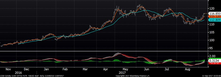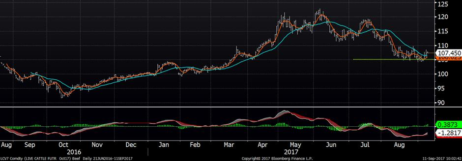 Le marché du bœuf a repris de la vigueur la semaine dernière sur les échéances plus éloignées dont le CàT de février qui est rendu à 117 ¢/lb, à un sommet depuis 1 mois. Inversement, le CàT d’octobre reste faible avec un prix qui reste près du support technique de 105 ¢/lb (à 107.8 ¢/lb présentement). Certains analystes parlent que le support de 105 ¢/lb sur octobre sera possiblement les bas du CàT et qu’on devrait rester dans la zone 105 – 110 ¢/lb. Par ailleurs, l’effet des ouragans Harvey et Irma reste ambiguë sur le marché du bœuf puisque d’un côté, l’offre en provenance du Texas sera moindre à court terme, mais c’est également vrai avec la demande des résidents de la Floride. L’USDA publiait les importations nettes de bœuf lesquelles étaient les plus élevées depuis juin 2016 à 62 M lbs. Les exportations restent stables avec 239 M lbs vendus en juillet, mais les importations ne cessent d’augmenter ce qui fait croitre l’offre de bœuf en sol américain. Les importations étaient de 301 M lbs, c’est la 1ère fois depuis août 2015 que les importations soient si élevées. Normalement, d’ici décembre, le marché américain devrait retourner graduellement du côté d’exportateur nette puisqu’ils atteindront sous peu le quota australien.