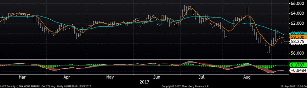 Pour les abattages de la semaine dernière, elles étaient de 2.17 M porcs puisque c’était une semaine de 4.5 jours en raison du férié de lundi. Cela demeure tout de même 4.0% de plus que l’an dernier durant la même semaine. Le poids carcasse est plus léger que l’an dernier à 207 lbs en baisse d’un peu moins que 2 lbs, ce qui donne une production de 450.2 millions lbs (3.3% vs 2016). Concernant les spéculateurs, entre le 30 août et le 5 septembre, ils ont vendu un total de 4500 CàT ce qui réduit leur position d’acheteur à 59,700 CàT.