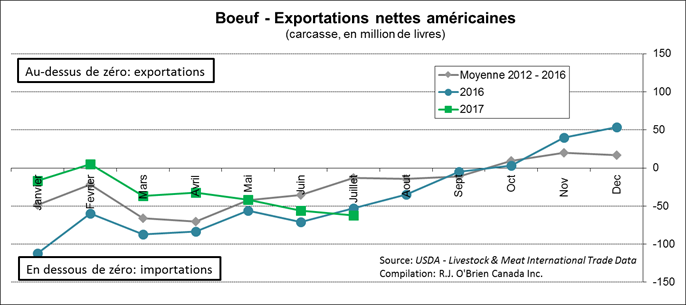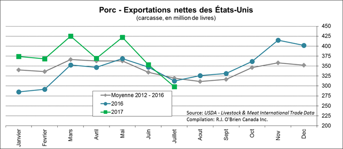 La semaine dernière, l’USDA a publié les exportations américaines de porc du mois de juillet lesquelles étaient inférieures à celles de l’an dernier, une première en 2017. Il faut dire que la valeur du porc était particulièrement élevée en juillet ce qui a possiblement freiné la demande. Tandis que les importations étaient similaires aux mois précédents, à 92 M lbs, ce sont les exportations qui ont fortement chuté à 390 M lbs ce qui donne des exportations nettes à 298 M lbs. Ce sont les plus faibles exportations nettes de porc depuis février 2016. La baisse des ventes est généralisée à travers de l’ensemble des clients, mais de façon plus prononcé en Chine et Hong-Kong qui ont seulement acheté 20 M lbs, soit la moitié du volume des mois précédents.
