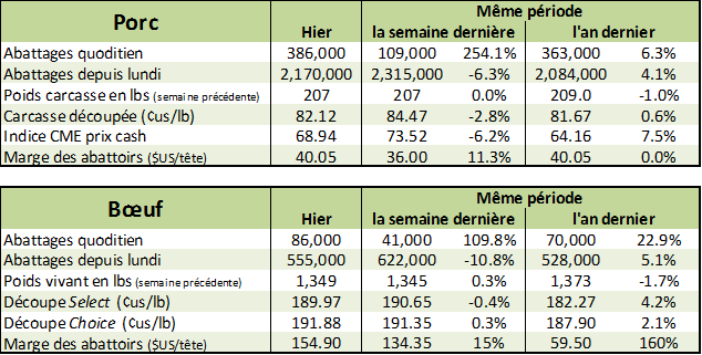 La semaine dernière, les abattages étaient de 555,000 têtes ce qui est 4.9% plus élevés que l’an dernier. Le poids demeure plus faible ce qui continue d’atténuer l’augmentation de la production, à 1349 lbs/vivant ou 820 lbs/carcasse, ce qui donnait une production en hausse de +2.7% à 454 M lbs. Chez les spéculateurs, il y a peu de changements depuis déjà quelques semaines. Entre le 30 août et 5 septembre, ils ont liquidé au net 3153 CàT portant leur position d’achat à 77,857 CàT.