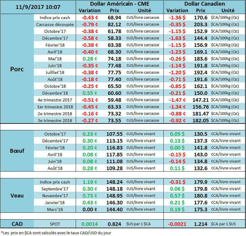 Les prix étaient plutôt volatiles la semaine dernière avec quelques jours ayant des variations de plus d’une cent la livre, mais au final, la semaine fût légèrement bénéfique pour le prix. Il y a eu de gros changements dans l’industrie des abattoirs avec le début des opérations des 2 nouveaux abattoirs américains. D’une part, l’abattoir de Seaboard Triumph Foods, à Sioux City en Iowa, a commencé les opérations et devrait atteindre une capacité de 10,000 porcs/jour dont 30% viendra des éleveurs locaux. D’autre part, le plant à Coldwater au Michigan, opéré par Clemens Food Groups, a également débuté le découpage des carcasses. L’investissement de 250 millions $US devrait atteindre la même capacité que celle de Seaboard Triumph Foods et s’approvisionnera dans un rayon de 240 km autour du plan. Avec ce rayon d’approvisionnement, le plant ne devrait pas acheter de porcs en Ontario. Ces 2 derniers jours, on note un ralentissement de la baisse du prix cash avec une diminution de -0.24 ¢/lb et de -0.63 ¢/lb le 6 et 7 septembre respectivement. Ça serait un peu précoce de dire que l’impact des nouveaux abattoirs se fait déjà ressentir sur le marché cash, mais ça ne devrait pas nuire! Aussi, l’augmentation de la capacité d’abattage aux États-Unis devrait fortement diminuer le risque de voir une dégringolade des prix en octobre comme ce fût le cas en 2016. Alors que la valeur de la carcasse découpée est similaire à l’an dernier, à 82 ¢/lb, le prix cash est 5 ¢/lb plus élevé que l’an dernier ce qui démontre que le marché est moins débalancé que l’an dernier. Aussi, l’USDA prévoit des prix au 4ème trimestre à 42 – 46 ¢/lb vivant (59.5 – 62 ¢/lb carcasse) et le CàT de décembre est à 58.3 ¢/lb. Pour les clients détenant des options put, il serait envisageable de vendre d’autres options put à un prix inférieur afin de transformer la protection illimitée en protection limitée, cela diminuera le coût de l’assurance.