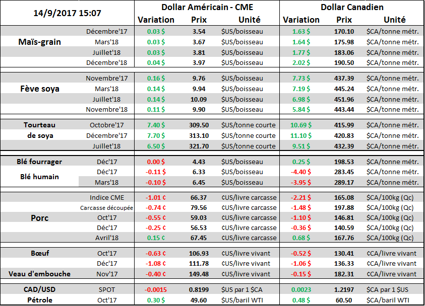 Face à l’annonce des analystes qui s’attendent à voir moins de soya en Argentine, le prix de la fève soya a monté de 15 ¢/boisseau (+1.6%) et le tourteau de 7.7 $US/tonne courte (+2.5%). Le prix du tourteau est à son plus haut niveau depuis le 10 août.