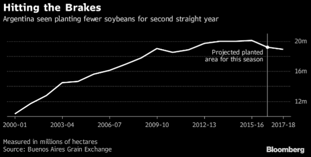Maintenant qu’on sait que la récolte de fève soya aux États-Unis sera un record, le marché tourne son attention vers l’hémisphère sud. L’Argentine, le 3ème plus important producteur de soya et le plus important exportateur de tourteau, devrait planter moins de soya et plus de maïs cet hiver. Pour les cultivateurs argentins, le maïs offre des profits plus intéressants ce qui causera une diminution des acréages de fève pour une deuxième année consécutive. La profitabilité de la culture du maïs est plus élevée que le soya parce que le gouvernement avait aboli la taxe à l’exportation en décembre 2015 alors que le soya continue d’être taxé à 30%, bien qu’il y ait une réduction graduelle à partir de janvier. La superficie en soya pourrait tomber à 19 millions d’hectares (47 millions d’acres) comparativement à 19.5 millions la saison précédente. Ce sera la première fois que les surfaces de soya diminueront pendant 2 années consécutives depuis que la Buenos Aires Grain Exchange compile les données (depuis 2000). La bourse publiera les intentions d’ensemencement pour la nouvelle récolte le 27 septembre. L’ensemencement de soya en Argentine commence habituellement vers la fin octobre.
